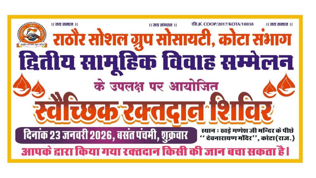 कोटा।राठौर सोशल ग्रुप सोसायटी कोटा संभाग ने समाजसेवा के क्षेत्र में एक बार फिर अनोखी और प्रेरणादायी पहल कर मिसाल कायम की है। “शादियों का शुभारंभ अब रक्तदान से”—इस भाव के साथ सोसायटी ने मानवता और सेवा को विवाह जैसे पावन संस्कार से जोड़ने का अभिनव संकल्प लिया है।