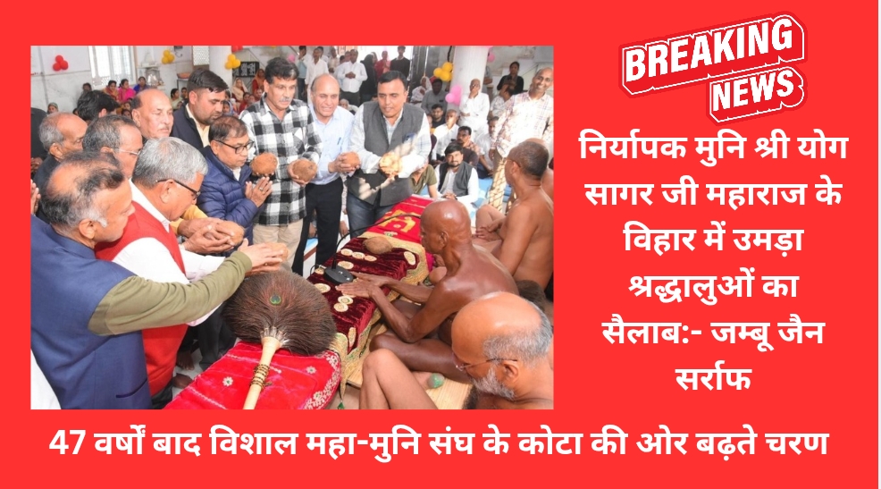 कोटा, 6 फरवरी। 47 वर्षों (वर्ष 1979) के अंतराल के पश्चात विशाल महा-मुनि संघ के कोटा की ओर बढ़ते चरणों को लेकर जैन समाज में विशेष उत्साह का वातावरण है। इस सदी के महानतम आचार्य, परम पूज्य संत शिरोमणि श्रमणयुग शिरोमणि आचार्य भगवंत श्री विद्यासागर जी महाऋषिराज के परम शिष्य एवं पूज्य आचार्य श्री समयसागर जी महाराज के ज्येष्ठ निर्यापक, राष्ट्रीय संत, तपस्वी पूज्य मुनि श्री योग सागर जी महाराज ससंघ के विहार में श्रद्धालुओं का सैलाब उमड़ पड़ा है।
