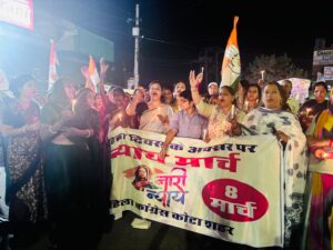 कोटा ।आज अंतर्राष्ट्रीय महिला दिवस के अवसर पर अखिल भारतीय महिला कांग्रेस के निर्देशानुसार महिला कांग्रेस कोटा शहर जिलाध्यक्ष शालिनी गौतम के नेतृत्व में महिला न्याय मार्च का आयोजन किया गया। यह न्याय मार्च संतोषी नगर चौराहे पर आयोजित किया गया, जिसमें महिला कांग्रेस की पदाधिकारी के साथ बड़ी संख्या में कांग्रेस कार्यकर्ताओं मौजूद रहे ।