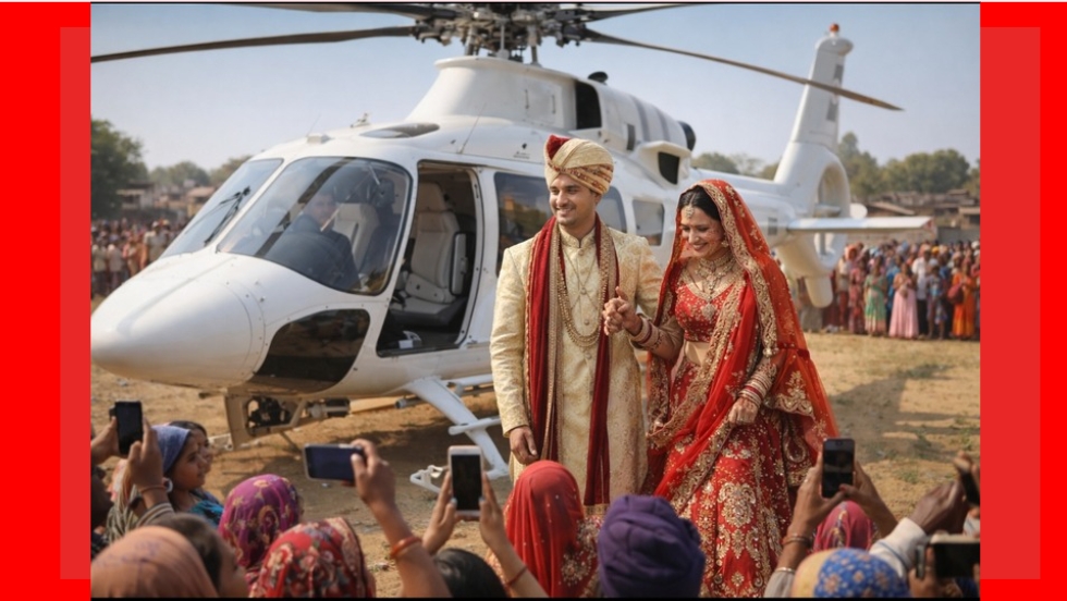 हेलीकॉप्टर के गांव में उतरते ही ग्रामीणों में उत्साह का माहौल बन गया और इस अनोखी शादी की चर्चा पूरे इलाके में होती रही।