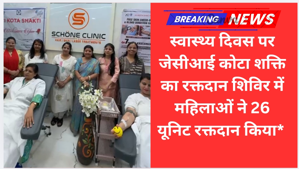 कोटा। जेसीआई कोटा शक्ति द्वारा आदित्य आवास स्थित शोन क्लिनिक में विश्व स्वास्थ्य दिवस के उपलक्ष्य में रक्तदान शिविर का आयोजन किया गया। शिविर में कुल 26 यूनिट रक्त एकत्रित किया गया।शिविर में महिलाओं ने बढ़-चढ़कर भागीदारी निभाते हुए रक्तदान के प्रति जागरूकता का संदेश दिया। इस अवसर पर डॉ. रीना जैन ने कहा कि रक्त का कोई विकल्प नहीं है और यह केवल मानव द्वारा रक्तदान से ही संभव है। उन्होंने बताया कि एक यूनिट रक्तदान से तीन लोगों को जीवनदान मिल सकता है, इसलिए प्रत्येक स्वस्थ व्यक्ति को नियमित रक्तदान करना चाहिए। जेसीआई कोटा शक्ति की अध्यक्ष प्रियंका गुप्ता , सचिव प्रीना ताम्बी व कोषाध्यक्ष ज्योति माहेश्वरी ने बताया कि शिविर में प्रोजेक्ट डायरेक्टर के रूप में रीना जैन, रुचिता जैन एवं सुचिता अग्रवाल ने सक्रिय भूमिका निभाई।शिविर के दौरान 45 लोगों का हीमोग्लोबिन, 67 का बीपी, 87 का वजन एवं 23 लोगों की शुगर जांच की गई।ब्लड कैम्प में अपना ब्लड बैंक की टीम ने सेवाए प्रदान की । इन्होंने किया जोड़े से रक्तदान