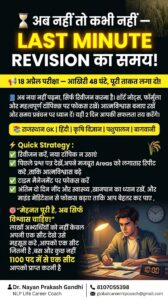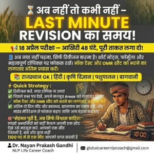 करियर एक्सपर्ट डॉ नयन प्रकाश गांधी का मानना है कि ऐसे घोर प्रतियोगी माहौल में सबसे पहले अभ्यर्थियों को यह समझना होगा कि यह अंतिम समय घबराने का नहीं, बल्कि अपने प्रयासों को सही दिशा में केंद्रित करने का है,यह सोचने का है कि आपको अपना एक पद एक सीट ग्रहण करनी है ,बेहतरीन परीक्षा पेपर को सॉल्व करके ,आपको लाखों अभ्यर्थियों के प्रतियोगी माहौल से घबराना नहीं है ,स्वय की सामर्थ्यता ,मेहनत ,अर्जित ज्ञान पर भरोसा कर अंतिम समय तक डटे रहना है । परीक्षा में पूछे जाने वाले विषय—राजस्थान सामान्य ज्ञान जिसमें हिस्ट्री ,कल्चर , और हिंदी विषय बहुत ही रोचक और स्कोरिंग विषय है , कृषि विज्ञान, पशुपालन और उद्यानिकी अभ्यर्थी के विषय के रुचिकर विषय और इस परीक्षा में प्रतियोगी माहौल बढ़ा देते है ,क्योंकि एग्रीकल्चर के सभी बारहवीं पास और यहां तक कि कृषि स्नातक अभ्यर्थी जो इस परीक्षा में भाग ले रहे है उनके लिए एक और यह विषय आसान रुचिकर है वही अगर पेपर आसान रहता है तो प्रतियोगी माहौल में और रोमांचक माहौल बढ़ सकता है ,इसलिए सेलेब्स के एक एक बिंदु पर विस्तृत अध्ययन करने वाले और कृषि को व्यवहारिक प्रायोगिक धरातल से रूबरू होने वाले अभ्यर्थी के लिए यह स्कोरिंग हो सकता है क्योंकि विषय के गहन अध्ययन के साथ उसका प्रायोगिक महत्व अनुभव अभ्यर्थी की विचारणीय क्षमता ,समझने की क्षमता विकसित करता है और इसमें सबसे बड़ी बात यह कि लाखों अभ्यर्थियों में एग्रीकल्चर के उच्चस्तरीय गुणवत्ता पूर्ण संस्थानों से जिसने नियमित शिक्षा ग्रहण की है ,जिसे कृषि का जमीनी अनुभव भी रहा हो वह इस परीक्षा को बहुत ही सरलता से निकाल पाएंगे
