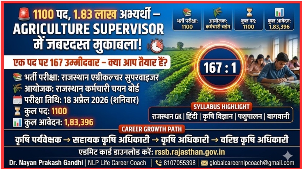 राजस्थान में आयोजित होने जा रही कृषि पर्यवेक्षक (एग्रीकल्चर सुपरवाइजर )भर्ती परीक्षा इस बार असाधारण प्रतिस्पर्धा के कारण चर्चा का विषय बनी हुई है। मात्र 1100 पदों के लिए लगभग 1,83,396 अभ्यर्थियों का आवेदन करना यह स्पष्ट संकेत देता है कि आज सरकारी नौकरियों के लिए संघर्ष अपने चरम पर है। लगभग 167:1 की प्रतिस्पर्धा यह बताती है कि इस परीक्षा में सफलता केवल मेहनत से नहीं, बल्कि सही दिशा में की गई रणनीतिक तैयारी से ही संभव है।