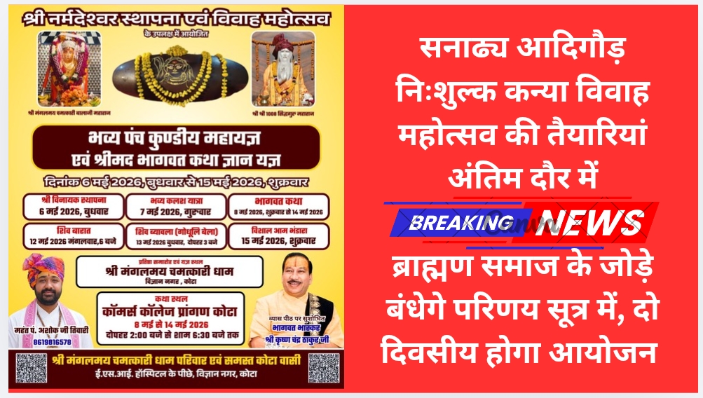 महोत्सव के मुख्य संयोजक समाजसेवी लोकेश शर्मा ने बताया कि सनाढ्य आदिगौड़ सामूहिक निःशुल्क कन्या विवाह महोत्सव का भव्य आयोजन 30 अप्रैल (गुरुवार) एवं 1 मई (शुक्रवार) को विक्रम संवत 2083, वैशाख शुक्ल पूर्णिमा के पावन अवसर पर किया जाएगा। कार्यक्रम स्थल सनाढ्य भवन, महावीर नगर प्रथम, जैन मंदिर के पास, कोटा निर्धारित किया गया है।