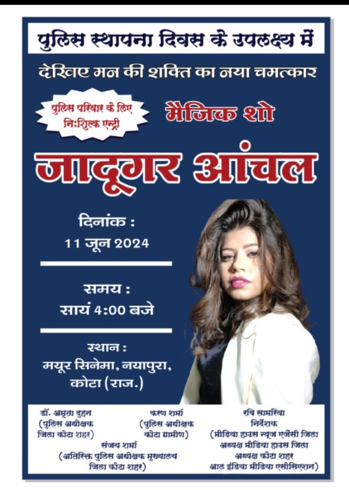 राजस्थान पुलिस के 75 में स्थापना दिवस के उपलक्ष में आज एक मोटिवेशनल सेमिनार और विश्व विख्यात जादूगर आंचल का लाइव शो आज नयापुरा स्थित मयूर सिनेमा में शाम 4:00 बजे आयोजित होगा, पुलिस जन और उनकी फैमिली के लिए प्रवेश निशुल्क रहेगा, कार्यक्रम संयोजक रवि सामारिया (जिला अध्यक्ष ऑल इंडिया मीडिया संगठन) ने बताया कि कार्यक्रम के मुख्य अतिथि डॉ. अमृता दुहन पुलिस अधीक्षक कोटा शहर, कोटा ग्रामीण से करण शर्मा, संजय शर्मा अतिरिक्त पुलिस अधीक्षक कोटा शहर मौजूद रहेगे, पुलिस परिवारों के इस आयोजित कार्यक्रम में जादूगर आंचल अपने 50 से अधिक जादू प्रस्तुत करेगी,