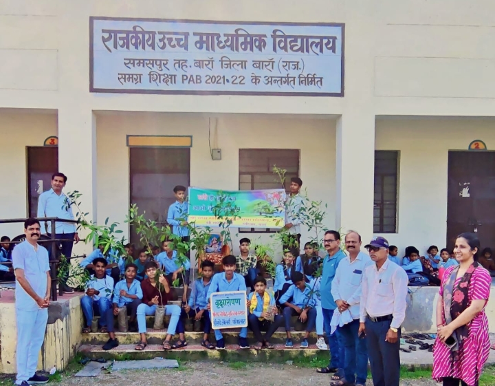 राजकीय उच्च माध्यमिक विद्यालय ग्राम समसपुर बारां में सघन *वृक्षारोपण* किया गया। विद्यालय प्राचार्य रामकरण बैरवा ने बताया कि श्री राधा गोविंद स्मृति सेवा संस्थान (श्री राधे ज्वेलर्स परिवार ….. बारां) द्वारा 75 पौधे प्रदान किए गए और विद्यालय परिसर में वृक्षारोपण किया गया ।इस अवसर पर संस्थान के मुकेश सोनी ने सभी को पर्यावरण के प्रति जागरूकता का संदेश दिया और सभी को पेड़ को अपना पारिवारिक हरित सदस्य बनाने के लिए संकल्प दिलवाया ,साथ ही बताया कि परिवार में कोई भी अवसर हो, एक *पौधा* जरूर लगाए और उसका संरक्षण करके उसको पेड़ बनाएं ।
