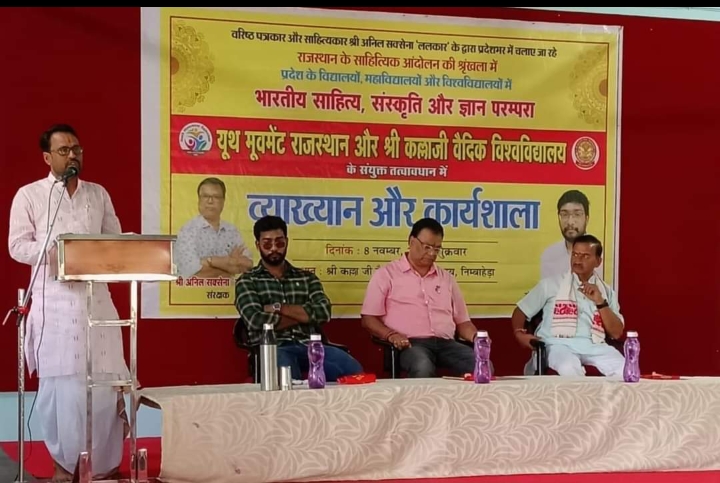 यह बात राजस्थान साहित्यिक आंदोलन के जनक वरिष्ठ पत्रकार और साहित्यकार अनिल सक्सेना ने शुक्रवार को श्रीकल्लाजी वैदिक विश्वविद्यालय के सभागार में मुख्य वक्ता के रूप में छात्रों को संबोधित करते हुए कही। वे राजस्थान के साहित्यिक आंदोलन की श्रृंखला में यूथ मूवमेंट राजस्थान और श्रीकल्लाजी वैदिक विश्वविद्यालय के संयुक्त तत्वावधान में भारतीय साहित्य, संस्कृति और ज्ञान परम्परा विषय पर आयोजित व्याख्यान कार्यक्रम में बोल रहे थे। उन्होंने कहा कि भारतीय संस्कृति विश्व की सबसे पुरानी और समृद्व संस्कृतियों में से एक है। इसका विस्तार हजारों वर्षो में हुआ और इसकी जड़ें वेदों, उपनिषदों, महाकाव्यों तथा विभिन्न धार्मिक ग्रंथों में गहराई से जुड़ी हुई है। भारतीय समाज में ‘‘वसुधैव कुटुंबकम‘‘ का सिद्वांत इस संस्कृति का मूल आधार है।