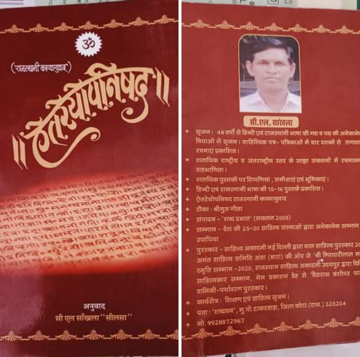 हिंदी अर राजस्थानी भासा का i साहित्यकार, केंद्रीय साहित्य अकादमी का बाल पुरस्कार सूं सम्मानित आदरजोग सी.एल. सांखला साहब कै द्वारा रची पोथी – ‘ऐतरेयोपनिषद को काव्यानुवाद’ अनुसिरजण की लै’ण मं एक महताऊ काम छै। यो भावानुवाद पढ़’र या बात समझी जा सकै छै कै अनुवाद कै द्वारा मूल कृति की आत्मा कै तांईं कस्यां अक्षुण्ण राख्यो जा सकै छै। लेखक को मानबो छै कै सिरजण ब्रह्मा जी कै जस्यो काम छै तो अनुसिरजण बुनकर कै जस्यो। लेखक का मन मं बचपन सूंईं ये सवाल हळोळा लेता र्या कै संसारी को रचाव क्यूं अर कस्यां होयो ? अस्या सवाल ज्यांको जवाब रिसी,मुनी, जोगी-जती, तपसी अर साधक बी नं जाण सक्या। लेखक कै तांईं यां संदांई अणसुळज्या सवालां को जवाब ऐतरेयोपनिषद की पोथी मं मल्यो, तो ईं पोथी की विचारणा कै तांईं स्हैज-सरल भासा मं जगती कै सामै लाबा को जतन सरु कर्यो। ईं जतन को परिणाम ईं छै कै ऐतरेयोपनिषद को राजस्थानी काव्यानुवाद आज आपणा हाथां मं छै। लेखक कै तांईं ईं उपनिसद मं जीव-जगत, आत्मा- परमात्मा सूं जुड़्या घणा अणसुळज्या सवालां को जवाब मल्यो छै। सबसूं महताऊ बात या छै कै ईं पोथी की विचारणा प्रकृति अर विज्ञान कै नजीक छै।