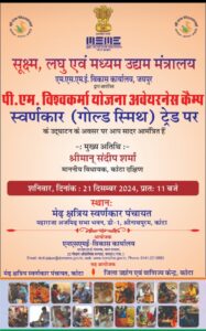 सूक्ष्म, लघु एवं मध्यम उद्यम मंत्रालय एम.एस.एम.ई. विकास कार्यालय, जयपुर ,पी.एम. विश्वकर्मा योजना अवेयरनेस कैम्प स्वर्णकार (गोल्ड स्मिथ) ट्रेड पर के उद्घाटन के अवसर पर आप सादर आमंत्रित हैं