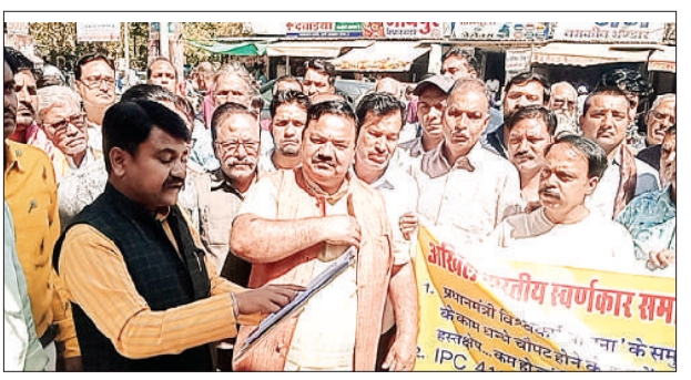 उपलब्ध करवाने, साथ ही बैंक की ओर से कम से कम 20 लाख की लिमिट बनाने, चोरी का माल जानकारी के अभाव में या अनजाने में स्वर्णकार व्यापारी द्वारा खरीदने पर व्यापारी के साथ बदसलूकी, दुर्व्यवहार, मानसिक, शारीरिक ओर आर्थिक दंड़ से भी उसको नुकसान नहीं पहुंचाने आदि मांगों का उल्लेख करते हुए सोने चांदी के भाव एक लिमिट मात्रा में बढ़ाने और इस पर भारत सरकार का कंट्रोल करने की मांग की गई है। इससे पूर्व जिले भर के स्वर्णकार समाज के लोग आजाद पार्क में एकत्रित हुए। जहां से जुलूस के रूप में कलेक्ट्रेट पहुंचे और प्रधानमंत्री नाम अपनी मांगों का ज्ञापन जिला कलेक्टर को सौंपा गया