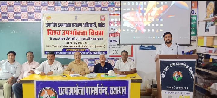 कोटा, 15 मार्च / विश्व उपभोक्ता दिवस 2025 पर संगोष्ठी का आयोजन संभागीय उपभोक्ता संरक्षण अधिकारी जितेंद्र कुमार के नेतृत्व में किया गया। इस वर्ष संगोष्टि का विषय “टिकाऊ जीवन शैली की ओर एक उचित कदम” था। कार्यक्रम में राज्य उपभोक्ता परामर्श केंद्र के अध्यक्ष पंकज शर्मा, संभागीय प्रभारी अखिल राजस्थान उपभोक्ता संगठन महासंघ के यज्ञ दत्त हाडा, पूर्व पार्षद व जिला समन्वयक कट्स इंटरनेशनल जयपुर के युधिष्ठिर चांनसी आदि उपस्थित थे। कार्यक्रम प्रारंभ से पूर्व सभी अतिथियों द्वारा सरस्वती की तस्वीर पर मल्यार्पण कर कार्यक्रम की शुरुआत की गई।