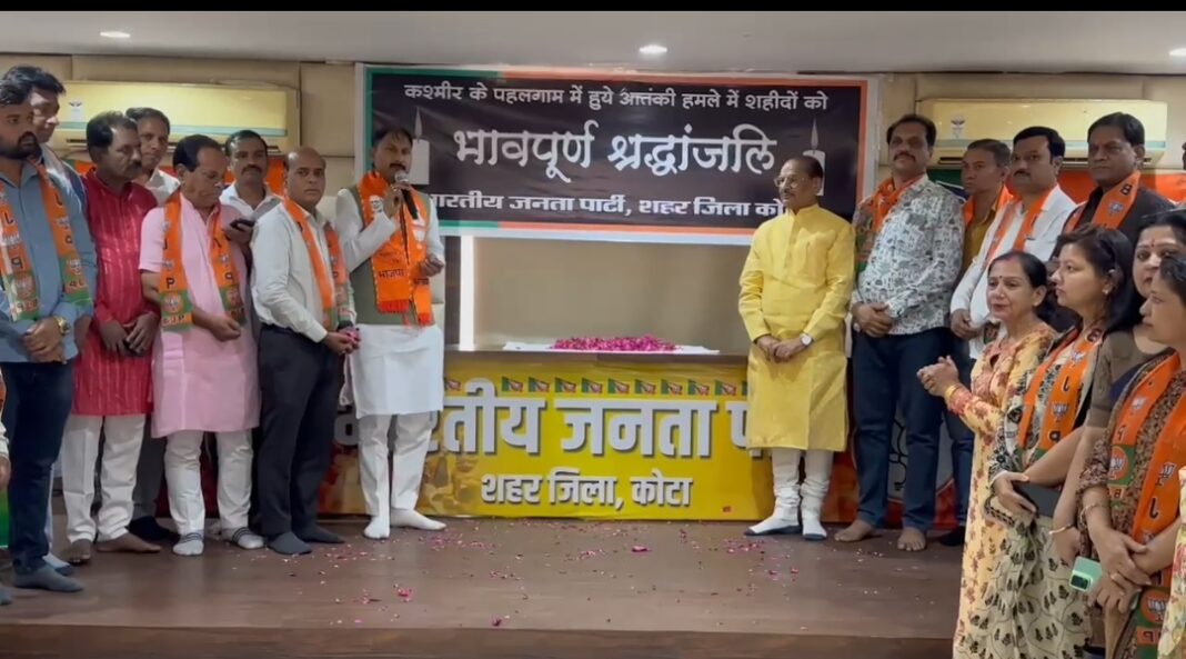 जिलाध्यक्ष राकेश जैन ने कहा कि पहलगाम में आतंकवादियों ने बेकसूर लोगो को धर्म पूंछकर, जाति पूंछकर, नाम पूंछ कर गोली मारकर हत्यायें की हैं। उन मृतकों की आत्मा को ईश्वर अपने श्रीचरणों में स्थान दें एवं दिवंगतों के परिवारजनों को इस दुख को सहन करने की शक्ति प्रदान करें। दिवंगतों को भारतीय जनता पार्टी शहर जिला कोटा द्वारा पुष्पांजलि अर्पित कर भावभीनी श्रृद्धांजलि की गई ।