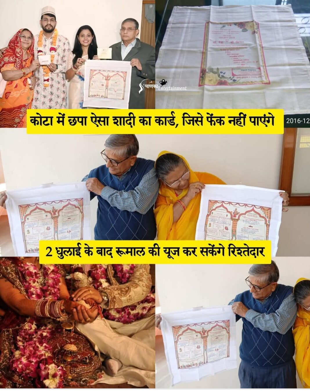 आमतौर पर शादी के निमंत्रण कार्ड कागज पर छपते हैं और बाद में कचरे में चले जाते हैं। लेकिन कोटा के एक डॉक्टर दंपति ने पर्यावरण संरक्षण और धार्मिक भावनाओं का सम्मान करने के लिए अनोखा कदम उठाया है। उन्होंनेअपने बेटे की शादी के लिए ऐसा कार्ड छपवाया है, जो दो बार धोने के बाद एक खूबसूरत रुमाल में बदल जाएगा!कैसे आया यह अनोखा आइडिया कोटा के रंगबाड़ी योजना में रहने वाले डॉ. गिरीश चंद्र शर्मा और डॉ. रश्मि तिवारी ने अपने बेटे गौरीज गौतम की शादी के लिए पारंपरिक पेपर कार्ड के बजाय इको.फ्रेंडली इनविटेशन कार्ड तैयार करवाने का फैसला किया। इंटरनेट पर सर्च के दौरान उन्हें महाराष्ट्र के पुणे में ऐसी तकनीक के बारे में पता चला, जिसके बाद उन्होंने फर्म से संपर्क किया और अनोखे रुमाल.कार्ड तैयार करवाए।