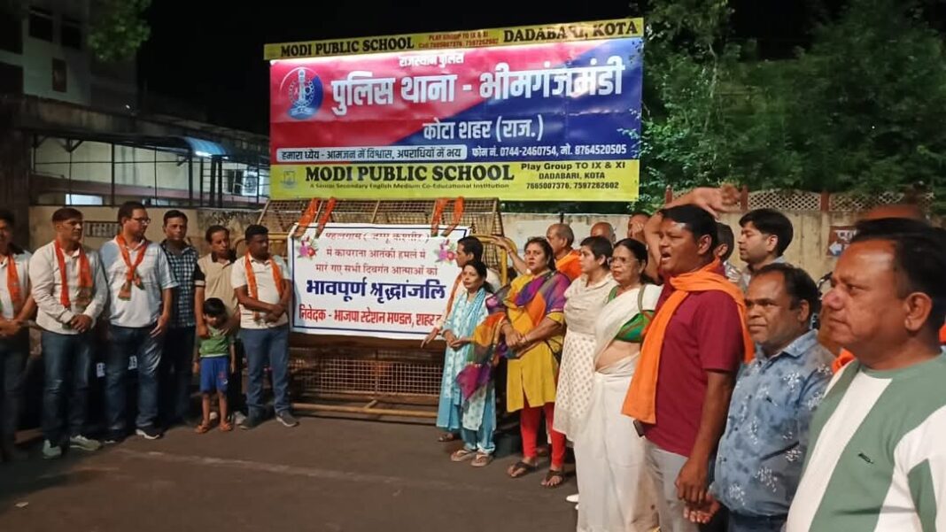 मण्डल के सभी कार्यकर्ताओं ने इस आतंकी हमले की घोर निंदा करते हुए भीमगंजमंडी थाने के सामने एकत्रित होकर मोमबत्ती जलाकर पाकिस्तान मुर्दाबाद, आतंकवाद हो बर्बाद के जोरदार नारे लगाते हुए दिवंगत आत्माओं की शांति हेतु दो मिनट का मौन धारण करते हुए भावपूर्ण श्रद्धा सुमन अर्पित किए।