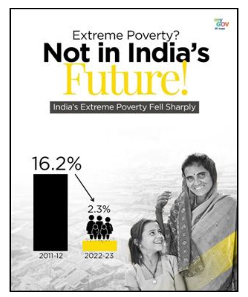 भारत की निर्णायक लड़ाई को स्वीकार किया है। रिपोर्ट के अनुसार, अत्यधिक गरीबी के लिए अंतरराष्ट्रीय बेंचमार्क प्रतिदिन 2.15 अमेरिकी डॉलर से कम पर जीवन यापन करने वाले लोगों का अनुपात, 2011-12 में 16.2 प्रतिशत से तेजी से गिरकर 2022-23 में केवल 2.3 प्रतिशत रह गया।