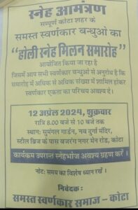 कोटा 10 अप्रैल/संपूर्ण कोटा शहर के समस्त स्वर्णकारो का होली स्नेह मिलन समारोह 12 अप्रैल सुमंगल गार्डन, नवदुर्गा मंदिर स्टील ब्रिज के पास बजरंग नगर में आयोजित किया जाएगा कार्यक्रम की जानकारी देते हुए सोनू आर्य ने बताया कि कोटा शहर के समस्त स्वर्णकार इस समारोह में अपनी उपस्थिति देंगे, स्वर्णकार एकता का यह अनूठा संगम होगा उन्होंने निवेदन किया है कि समस्त स्वर्णकार इस आयोजन में शामिल हो स्वर्णकार एकता का परिचय दे कार्यक्रम के उपरांत स्नेह भोज का आयोजन किया गया है