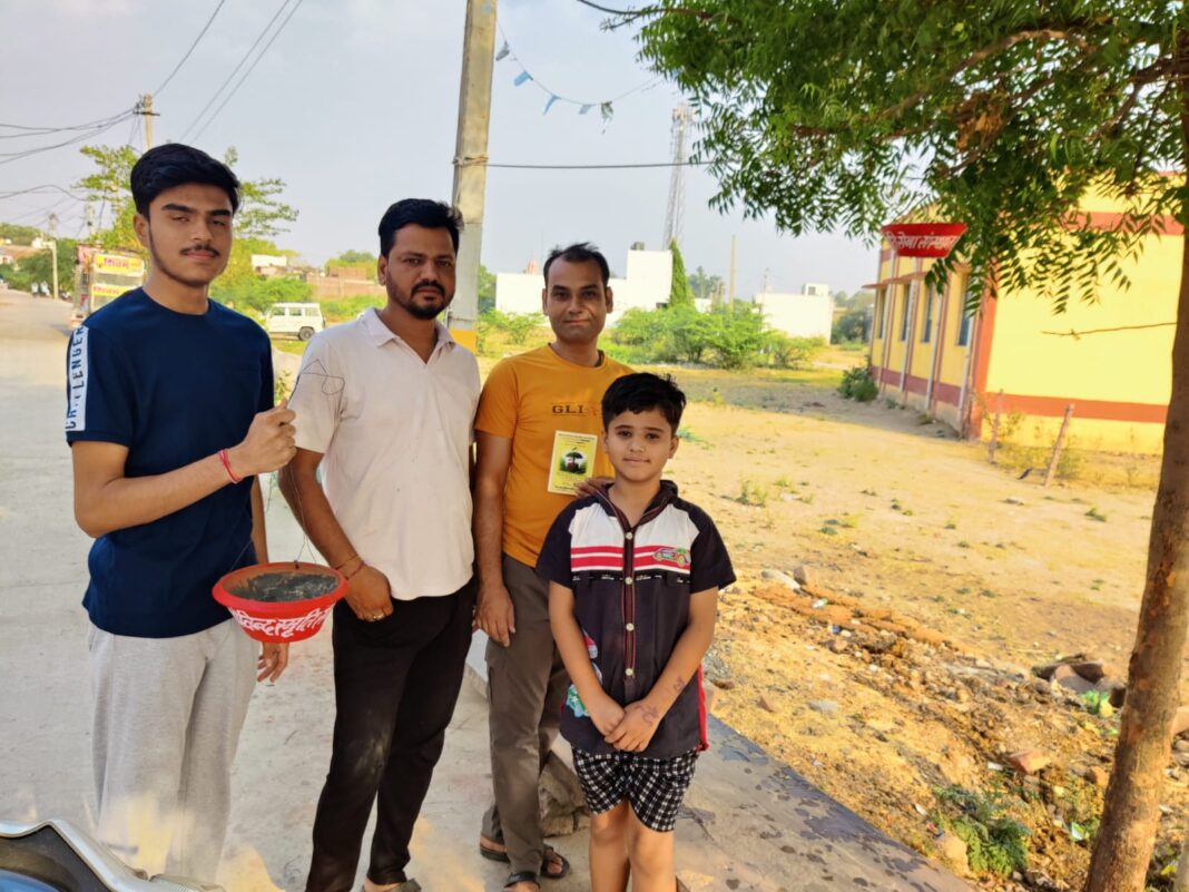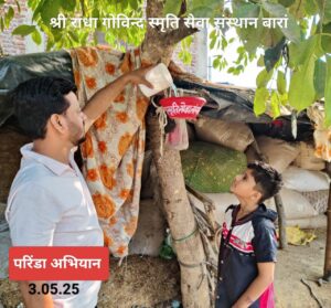 इसलिए हमें अधिक से अधिक परिंडे लगाकर,प्रतिदिन इन में दाना पानी की व्यवस्था करनी चाहिए । क्योंकि जीव दया ही मनुष्य का सबसे बड़ा धर्म है। संस्थान के कपिल,मोहन सोनी ने इस अभियान के माध्यम से लोगों से अपील की है,कि जिन्होंने इस भीषण गर्मी में अभी तक अपने घर आंगन में, बालकनी में ,छत पर अगर परिंडा नहीं लगाया हो तो वह एक परिंडा इन मासूम पक्षियों के लिए जरूर लगाए और उसमें प्रतिदिन दाना पानी की व्यवस्था का संकल्प ले।आज के इस अभियान में मोहन सोनी , हर्षू, प्रमोद, माधव, प्रदीप आदि का सहयोग रहा।