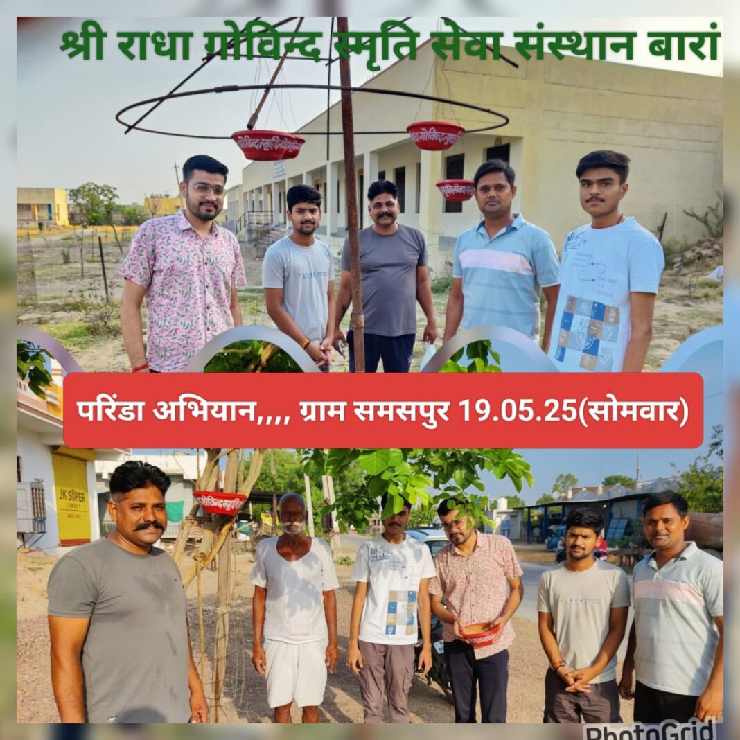 बारां/श्री राधा गोविंद स्मृति सेवा संस्थान (श्री राधे ज्वेलर्स …परिवार बारां) के द्वारा चलाए जा रहे सघन *परिंडा अभियान* के तहत आज समसपुर ग्राम के विभिन्न क्षेत्रों में बांधे गए परिंडे।संस्थान के पीयूष गुप्ता,माधव सोनी ने बताया कि इस भीषण गर्मी में संस्थान द्वारा चलाए जा रहे निरंतर परिंडा अभियान के तहत आज समसपुर ग्राम के विभिन्न क्षेत्र में परिंडे लगाए गए और लोगों को उनमें प्रतिदिन दाना पानी की व्यवस्था के लिए संकल्प दिलाया।