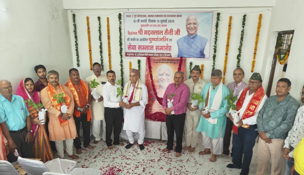 कोटा। भाजपा के पूर्व प्रदेश अध्यक्ष व राज्यसभा सांसद स्वर्गीय मदनलाल सैनी की 82वीं जयंती आज सेवा सम्मान और पौधा वितरण के साथ मनाई गई कार्यक्रम में सीएमएचओ डॉक्टर नरेंद्र नागर ने मुख्य अतिथि के रूप में शिरकत की वही कार्यक्रम की अध्यक्षता कैप्टन बीएल सुमन ने की मंच संचालन पुरुषोत्तम अजमेरा ने किया इस अवसर पर वरिष्ठ डॉक्टर साहित्यकार कई वरिष्ठ कार्यकर्ता प्रशासनिक ऑफिसर अखाड़े के उस्ताद समाजसेवी प्रबुद्ध जनों का माला शॉल प्रतीक चिन्ह भेंटकर मनाया गया यह कार्यक्रम केशवपुरा में आयोजित किया गया जहां पर पूर्व प्रदेश अध्यक्ष के दामाद और समाजसेवी डॉक्टर दुर्गा शंकर सैनी ने बताया कि इस अवसर पर डॉक्टर गोपाल सिंह वरिष्ठ कवि रघुराज सिंह साहित्यकार कवि गोरस प्रचंड सूबेदार दीनदयाल नागर सामाजिक कार्यकर्ता बाबूलाल पूर्व पार्षद राम शंकर माली अनंत चतुर्दशी आयोजन समिति प्रभारी सुमेर सिंह डॉक्टर गिरधर गुप्ता वरिष्ठ स्त्री रोग विशेषज्ञ डॉक्टर शोभा मिश्रा दुर्गा शक्ति व्यायाम शाला की महिला उस्ताद संतोष सुमन आनंद हजारी पार्षद राकेश पुटरा नंद सिंह जगदीश सुमन सहित कई गणमान्य लोगों का इस अवसर पर सम्मान किया गया वही पौधारोपण पर्यावरण बचाने का संकल्प लेते हुए सभी को बीलपत्र के पौधे भी वितरित किए गए इस अवसर पर सम्मानित होने वाले सभी लोगों ने पूर्व प्रदेश अध्यक्ष स्वर्गीय मदनलाल सैनी के जीवन पर अपने विचार व्यक्त किये