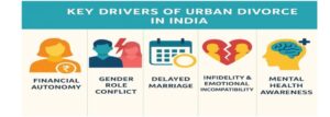 1. पारंपरिक ढांचे पर दबाव एवं तलाक के बढ़ते मामले:शहरीकरण ने भारत में पारंपरिक संयुक्त परिवार व्यवस्था को चुनौती दी है। जैसे-जैसे लोग गाँव से शहरों की ओर जा रहे हैं, पारिवारिक संरचना में बदलाव आ रहा है और तलाक अब छिपा हुआ मुद्दा नहीं रहा। बड़े शहरों जैसे दिल्ली, मुंबई, बेंगलुरु आदि में तलाक की दर राष्ट्रीय औसत से कई गुना अधिक है और बीते वर्षों में आवेदन भी तीन गुना तक बढ़ गए हैं। यह सामाजिक बदलाव गहरे से जड़े कलंक को कम कर रहा है, जिससे लोग असमर्थकारी विवाह से बाहर निकल पा रहे हैं।