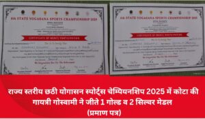 प्रतियोगिता में कोटा की योग साधिका गायत्री गोस्वामी ने शानदार प्रदर्शन करते हुए 1 स्वर्ण (Gold) व 2 रजत (Silver) मेडल अपने नाम किए। गायत्री की इस सफलता से कोटा जिले का नाम एक बार फिर योगासन खेलों में पूरे प्रदेश में रोशन हुआ।