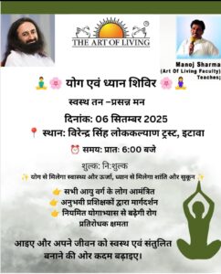 इटावा/वर्तमान बढ़ते हुए तनाव और गलत खान पान से बढ़ती बिमारियों से हर व्यक्ति को स्वास्थ्य के प्रति जागरूक बनाने के उद्देश्य से ‘योगाभ्यास और ध्यान योग के एक दिवसीय शिविर के विषय पर परिचर्चा हुई जिसमें रूपनारायण’संजय शर्मा ने बताया कि इटावा में पहली बार श्री श्री रवि शंकर जी से प्राप्त कोटा के आर्ट ऑफ लिविंग के संस्था के वरिष्ठ प्रशिक्षण मनोज शर्मा द्वारा ज्ञानयोग और ध्यान योग का प्रशिक्षण दिया जाएगा,यह कार्यक्रम विरेन्द्र सिंह लोककल्याण ट्रस्ट में 06 सितम्बर, शनिवार को सुबह 6 बजे से रखना तय किया गया इसमें हर आयु वर्ग के व्यक्ति शामिल हो सकते हैं इस अवसर पर सुरेन्द्र परिहार, प्रेम शास्त्री, केशरी लाल नागर, धनराज पारेता, जितेंद्र नागर, हरिश शर्मा, धर्मेन्द्र तिवारी, पार्षद गायत्री सोनी, महावीर शर्मा, लोकेश शर्मा आदि की सहमति ली गई