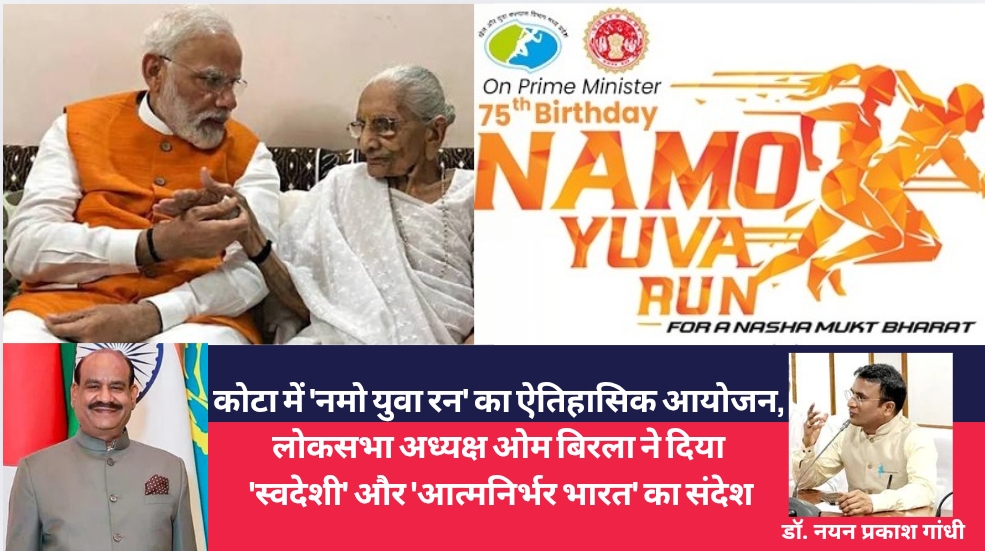 वह युवाओं के लिए एक मिसाल बन गया ।युवा मैनेजमेंट विश्लेषक पब्लिक पॉलिसी एक्सपर्ट यूथ सशक्तिकरण कोच डॉ. नयन प्रकाश गांधी ने बताया कि भाजपा कोटा शहर के जिला अध्यक्ष युवाओ की शान राकेश जैन की अगुवाई में और विश्व में अपने व्यक्तित्व से कोटा का नाम रोशन करने वाले यशस्वी लोकसभाध्यक्ष ओम बिरला के मुख्य आतिथ्य में इस प्रधानमंत्री मोदी के जन्मदिवस के सेवा पखवाड़ा के तहत भव्य नमो युवा रन का आयोजन को ऐतिहासिक रूप से युवाओं महिलाओं युवतियों ,वरिष्ठ जनों का सैलाब को पूरे भारत ही नहीं विश्व ने देखा, आज कोटा शिक्षा नगरी की कोचिंग ,कचौरी और कोटा स्टोन पूरे विश्व में विख्यात है ,अब युवाओं के इस जन सैलाब ने दिखा दिया कि कोटा किसी से कम नहीं , लोकसभाध्यक्ष एवं लोकप्रिय सांसद कोटा बूंदी ओम बिरला ने युवाओं ,महिलाओं को सशक्त राष्ट्र की मुहिम के तहत स्वदेशी अपनाने का आव्हान किया और नियमित दिनचर्या में स्वास्थ्य को प्राथमिकता पर जोर दिया ,मंच पर उपस्थित विधायक जन जन के लाडले संदीप शर्मा ,कल्पना देवी ने आत्मनिर्भर भारत की मुहिम को समर्थन दिया और हजारों यूवाओ को शपथ ग्रहण करवाई गई।