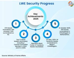अकेले वर्ष 2025 में सुरक्षा बलों ने 270 नक्सल उग्रवादियों को मुठभेड़ में मार गिराया, 680 नक्सलियों को गिरफ्तार किया और करीब 1225 नक्सलियों को आत्मसमर्पण करने के लिए बाध्य किया। सुरक्षा बलों की तरफ से ऑपरेशन ब्लैक फॉरेस्ट जैसे अभियान और बीजापुर , छत्तीसगढ़ और महाराष्ट्र में नक्सलियों द्वारा बड़े पैमाने पर किये गए आत्मसमर्पण से नक्सल उग्रवादियों को जीवन की मुख्यधारा में शामिल होने की महती प्रेरणा मिली है।