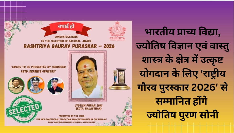 कोटा/गणतंत्र दिवस के अवसर पर जयपुर में आयोजित होने वाले भव्य राष्ट्रीय गौरव सम्मान समारोह में राजस्थान के कोटा निवासी प्रसिद्ध ज्योतिषाचार्य एवं प्राच्य विद्या विशेषज्ञ ज्योतिष पुरण सोनी को भारतीय प्राच्य विद्या, ज्योतिष विज्ञान एवं वास्तु शास्त्र के क्षेत्र में उनके उल्लेखनीय योगदान के लिए ‘राष्ट्रीय गौरव पुरस्कार 2026’ से सम्मानित किया जाएगा। ज्योतिष पुरण सोनी विगत कई वर्षों से भारतीय प्राचीन ज्ञान परंपरा को जन-जन तक पहुँचाने के कार्य में निरंतर सक्रिय हैं। ज्योतिष विज्ञान, वास्तु शास्त्र एवं वैदिक परामर्श के माध्यम से उन्होंने हजारों लोगों को जीवन की जटिल समस्याओं से मार्गदर्शन प्रदान किया है। उनके परामर्श से अनेक परिवारों को मानसिक शांति, सकारात्मक दिशा एवं स्थिरता प्राप्त हुई है। उन्होंने भारतीय प्राच्य विद्या को केवल भविष्य कथन तक सीमित न रखते हुए उसे जीवन सुधार, नैतिक मूल्यों, सकारात्मक सोच और समाज कल्याण से जोड़ा है। वास्तु शास्त्र के क्षेत्र में उनके व्यावहारिक सुझावों से लोगों के घर, व्यवसाय और कार्यस्थलों में सकारात्मक परिवर्तन देखने को मिले हैं। ज्योतिष पुरण सोनी का मानना है कि भारतीय ज्ञान परंपरा हमारी सांस्कृतिक धरोहर है, जिसे आधुनिक समाज के अनुरूप सरल और उपयोगी रूप में प्रस्तुत करना आवश्यक है। इसी उद्देश्य से वे निरंतर अध्ययन, शोध एवं जनसेवा के माध्यम से प्राच्य विद्या का प्रचार-प्रसार कर रहे हैं। उनकी विद्वत्ता, समाज के प्रति समर्पण एवं भारतीय प्राच्य विद्या के संरक्षण एवं संवर्धन में दिए गए महत्वपूर्ण योगदान को देखते हुए चयन समिति द्वारा उन्हें ‘राष्ट्रीय गौरव पुरस्कार 2026’ के लिए चयनित किया गया है।