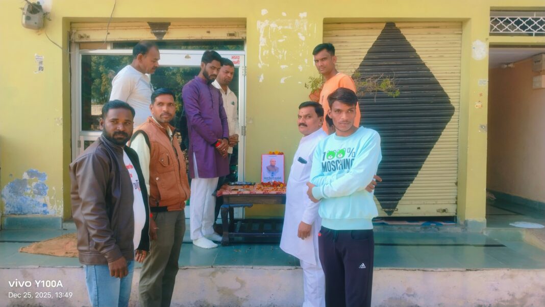 कोटा/उपखंड के धुलेट कस्बे के भाजपा कार्यकर्ताऔ ने भारत के पूर्व प्रधानमंत्री भारत रत्न श्री अटल बिहारी बाजपाई की जयन्ती पर पुष्पांजलि अर्पित कर मोन रह कर श्रध्दांजली दी।इस दोरान भाजपा यूवा नेता ईश्वर सेन ने पुर्व प्रधान मंत्री अटल बिहारी बाजपाई की हस्त लिखि पंक्तियाँ टूटे हुए सपनों की कौन सुने सिसकी?