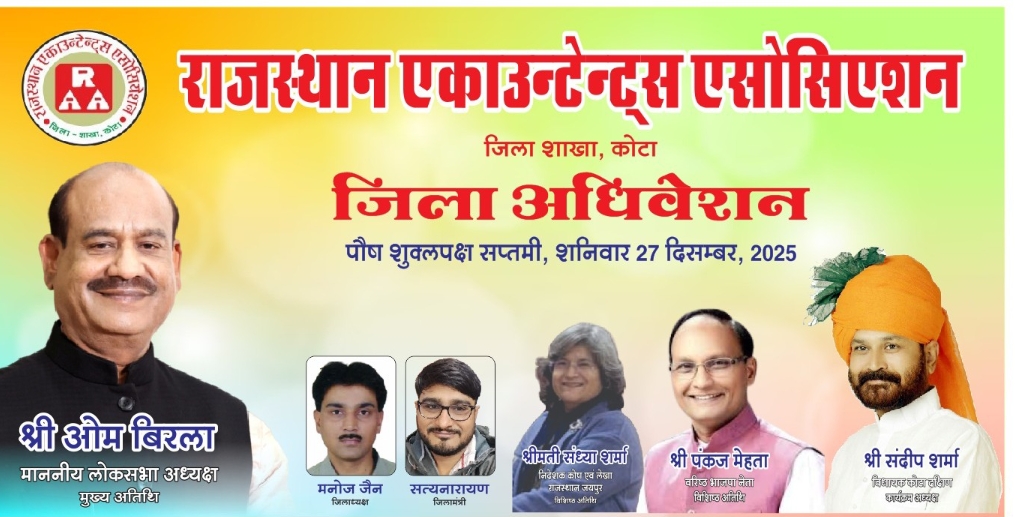 कोटा /राजस्थान एकाउंटेंट्स एसोसिएशन, कोटा का जिला अधिवेशन 27 दिसंबर को शिव ज्योति कॉन्वेंट स्कूल, श्रीनाथपुरम, कोटा में आयोजित किया जाएगा। जिला अध्यक्ष मनोज जैन चतर ने बताया कि समारोह के मुख्य अतिथि लोकसभा अध्यक्ष ओम बिरला होंगे, संदीप शर्मा, विधायक कोटा दक्षिण, अध्यक्षता करेंगे। विशिष्ट अतिथि संध्या शर्मा, निदेशक, कोष एवं लेखा विभाग, राजस्थान, एवं वरिष्ठ भाजपा नेता पंकज मेहता होंगे। विशेष आमंत्रित सदस्यों में लालचंद यादव प्रदेश अध्यक्ष, दिनेश जैन पूर्व प्रदेश अध्यक्ष, अजय सोरल पूर्व जिला अध्यक्ष एवं कार्यक्रम संयोजक होंगे।